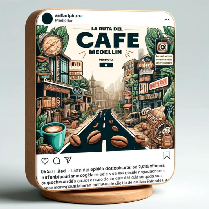 Artículo de blog titulado «La Ruta del Café en Medellín», que es promocionado a través de una publicación de Instagram.