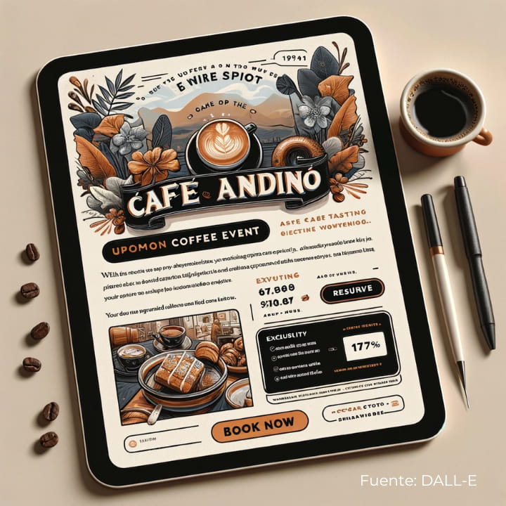 Diseño Visual. Crean anuncios visuales llamativos que muestran imágenes de su café, acompañadas de texto que invita a los clientes a visitar durante eventos especiales.