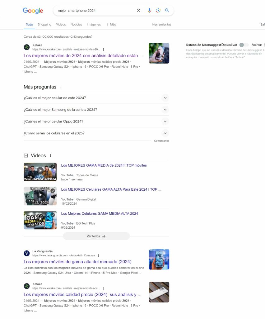 Al igual que en las búsquedas móviles, esto sugiere que hay menos de 10 resultados orgánicos en la primera página, lo que puede ser una combinación de la evolución de los algoritmos de Google y la presentación de otros tipos de contenido en los resultados de búsqueda.