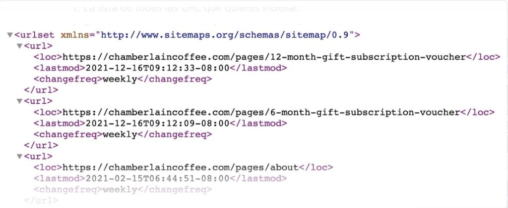 Aquí tienes un ejemplo de cómo es un mapa del sitio XML: